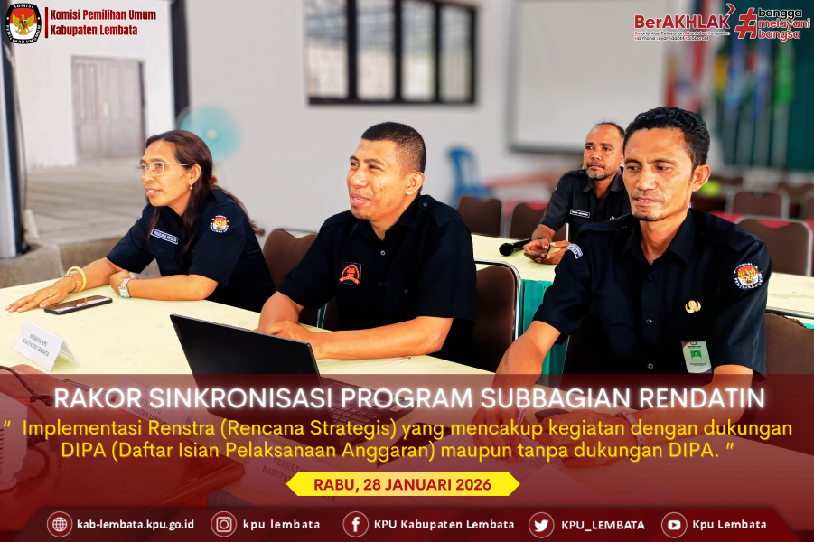 Halo, #TemanPemilih! KPU Kabupaten Lembata mengikuti kegiatan Rapat Koordinasi Sinkronisasi Program dan Kegiatan Tahun 2026 untuk Subbagian Rendatin yang dilaksanakan oleh KPU Provinsi Nusa Tenggara Timur secara daring dari aula KPU Kabupaten Lembata pada Rabu, 28 Januari 2026. Kegiatan ini dihadiri oleh Anggota KPU Kabupaten Lembata Idris Beda dan Paulina Y. B. Tokan, Kasubag Rendatin Melkiadus Nong Akel, serta 2 staf Rendatin. Ketua Divisi Perencanaan dan Informasi KPU Provinsi NTT, Lodowyk Fredrik, menjadi narasumber dalam kegiatan ini. Beliau didampingi oleh Kasubag Perencanaan KPU Provinsi NTT, Lusia A.D.P. Hekopung. Dalam rapat tersebut ditegaskan bahwa masih terdapat ketidaksesuaian nomenklatur jabatan dan subbagian. Selain itu, rapat juga membahas implementasi Renstra (Rencana Strategis) yang mencakup kegiatan dengan dukungan DIPA (Daftar Isian Pelaksanaan Anggaran) maupun tanpa dukungan DIPA. Seluruh kegiatan tersebut tetap menjadi bagian dari komitmen kinerja yang harus dilaksanakan. Untuk menghindari simpang siur dalam pelaksanaan program, narasumber menyampaikan perlunya perapihan rencana aksi secara komprehensif. Penyusunan rencana aksi tingkat provinsi akan dilakukan dengan menunggu dan mengakomodasi masukan dari KPU Kabupaten/Kota agar pelaksanaannya selaras dan jelas. Selain itu ada pula penyelarasan nomenklatur jabatan, penguatan pemahaman tugas Rendatin, serta perapihan rencana aksi berbasis DIPA dan Perjanjian Kinerja. KPU Provinsi dapat melakukan koordinasi pelaksanaan kinerja Rendatin di seluruh satuan kerja KPU, secara khusus di Provinsi NTT, dengan lebih efektif dan terkoordinasi sebagaimana penyelarasan tersebut. #KPULembata #KPUMelayani #ParmasKPULembata ....