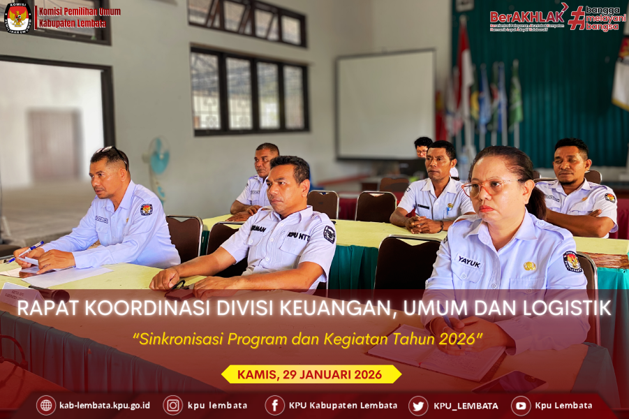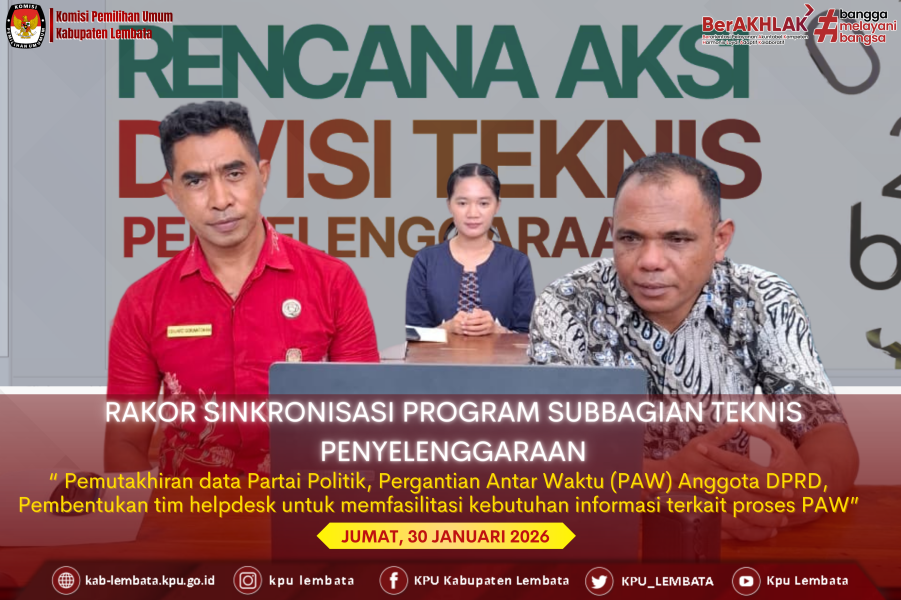 Halo, #TemanPemilih! KPU Kabupaten Lembata mengikuti Rapat Koordinasi (Rakor) Sinkronisasi Program dan Kegiatan Tahun 2026 untuk Divisi Teknis Penyelenggaraan secara daring dari ruang Subbagian Teknis KPU Kabupaten Lembata pada Jumat, 30 Januari 2026. Kegiatan yang diselenggarakan oleh KPU Provinsi Nusa Tenggara Timur ini dihadiri oleh Anggota KPU Kabupaten Lembata selaku Ketua Divisi Teknis Penyelenggaraan KPU Lembata Ibrahim Kader, Kasubag Teknis Penyelenggaraan Eduard O. B. Gorantokan bersama staf Teknis Penyelenggaraan dan Hukum. Dalam arahannya, Anggota KPU Provinsi NTT selaku Ketua Divisi Teknis Penyelenggaraan, Elyaser Lomi Rihi, memaparkan dua rencana aksi besar yang menjadi fokus utama di tahun 2026 yakni pemutakhiran data partai politik dan melaksanakan pemutakhiran data peserta pemilu sesuai regulasi yang berlaku. Kegiatan ini dilaksanakan secara rutin setiap semester. Selain itu ada juga Pergantian Antar Waktu (PAW) Anggota DPRD, yang mana dilakukan untuk verifikasi administrasi PAW Anggota DPRD sesuai dengan ketentuan waktu yang berlaku. Ia juga menyampaikan untuk membangun komunikasi langsung dengan pihak DPRD mengenai anggota yang diganti maupun penggantinya, yang mana hal ini merujuk pada PKPU Nomor 3 Tahun 2025. Selain itu ada pula pembahasan mengenai pelayanan informasi. Ia menekankan pembentukan tim helpdesk untuk memfasilitasi kebutuhan informasi terkait proses PAW. Sebagai catatan penutup, Elyaser menekankan pentingnya memantau keaktifan partai politik di tingkat daerah. Ia menginstruksikan KPU Kabupaten untuk melakukan koordinasi yang lebih intens dengan pengurus Partai Politik guna memastikan sinkronisasi data dan administrasi berjalan tanpa kendala. #KPULembata #KPUMelayani #ParmasKPULembata ....