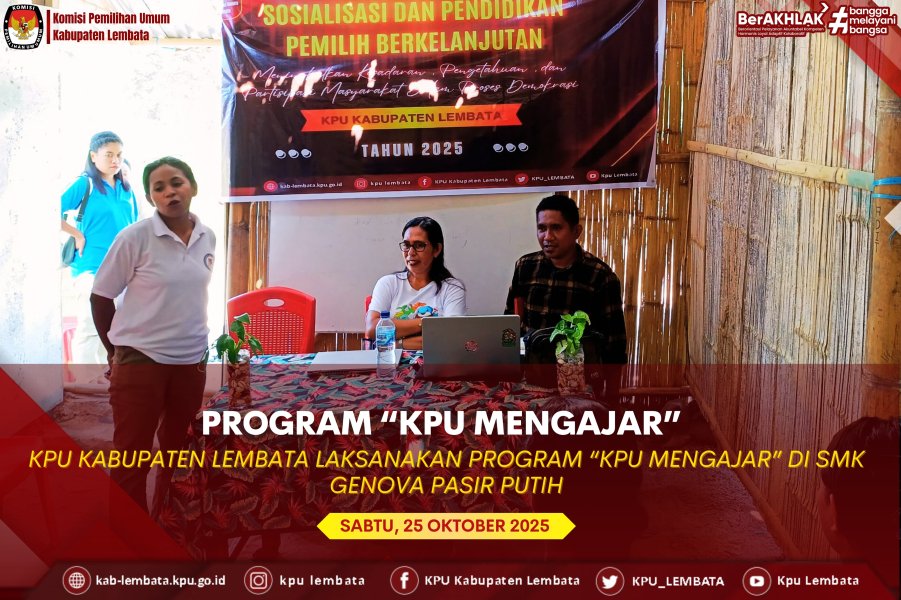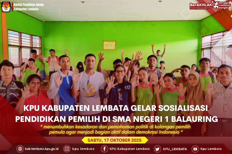KPU Kabupaten Lembata Gelar Sosialisasi Pendidikan Pemilih di SMA Negeri 1 Balauring #TemanPemilih, KPU Kabupaten Lembata menyelenggarakan kegiatan Sosialisasi Pendidikan Pemilih di SMA Negeri 1 Balauring pada Sabtu, 18 Oktober 2025. Hadir dalam kegiatan tersebut Anggota KPU Kabupaten Lembata, Paulina Y. B. Tokan bersama staf. Kegiatan ini menghadirkan narasumber Jalal Rebong, S.Pd, guru sekaligus pegiat literasi dan pemilu dari SMAN 1 Balauring. Dalam materinya yang berjudul “Pelopor Pemilih Pemula dalam Demokrasi Indonesia”, Jalal Rebong menekankan pentingnya peran generasi muda dalam menjaga kualitas demokrasi. “Tantangan pemilih pemula itu seperti kurangnya pengetahuan tentang politik, mudah terpengaruh berita palsu, dan mereka merasa suara tidak berpengaruh,” ungkapnya. Sementara itu, Paulina Y. B. Tokan menegaskan bahwa pendidikan pemilih merupakan bagian penting dari proses pembelajaran demokrasi. “Pendidikan pemilih harus terus dilaksanakan, untuk kita semua belajar tentang demokrasi,” ujarnya. Perwakilan Humas SMAN 1 Balauring juga menyampaikan dukungannya terhadap kegiatan ini. “Kami sangat mendukung kegiatan KPU Lembata untuk membentuk pemilih yang cerdas, demi kemajuan tanah air, khususnya untuk Lembata,” ujarnya. Materi sosialisasi yang dibawakan memuat pemahaman tentang konsep dasar demokrasi, asas-asas pemilu (Langsung, Umum, Bebas, Rahasia, Jujur, dan Adil), tahapan pemilu, serta peran strategis pemilih pemula. Peserta juga diajak berdiskusi interaktif melalui sesi kuis refleksi seputar demokrasi dan kepemiluan. Kegiatan ditutup dengan pesan dari Paulina kepada para siswa, "Jadilah pelopor pemilih pemula yang bertanggung jawab dan aktif berpartisipasi dalam pemilu mendatang karena adik-adik akan menjadi pemimpin di masa depan,” demikian pesan beliau. KPU Lembata berharap kegiatan ini dapat menumbuhkan kesadaran dan pemahaman politik di kalangan pemilih pemula agar menjadi bagian aktif dalam demokrasi Indonesia. #KPULembata #KPUMelayani