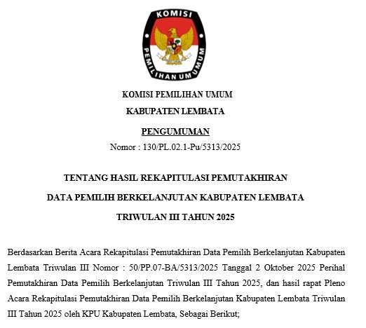 BERIKUT LAMPIRAN HASIL REKAPITULASI PEMUTAKHIRAN DATA PEMILIH BERKELANJUTAN KABUPATEN LEMBATA TRIWULAN III TAHUN 2025 SELENGKAPNYA BISA DI UNDUH MELALUI LINK BERIKUT :