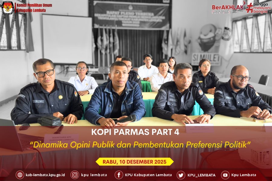 KPU Kabupaten Lembata mengikuti kegiatan KoPi Parmas (Kita Omong Pemilu, Demokrasi dan Partisipasi Masyarakat) Part 4 yang diselenggarakan KPU Provinsi Nusa Tenggara Timur (NTT) secara daring dari aula KPU Lembata pada Rabu, 10 Desember 2025. Kegiatan tersebut dihadiri Ketua KPU Kabupaten Lembata Hermanus Haron Tadon, Anggota Petrus Paulus Juang dan Idris Beda. Turut hadir Sekretaris KPU Kabupaten Lembata Konradus Liwu, Kasubag Parmas SDM Joenady Wongso serta para staf.