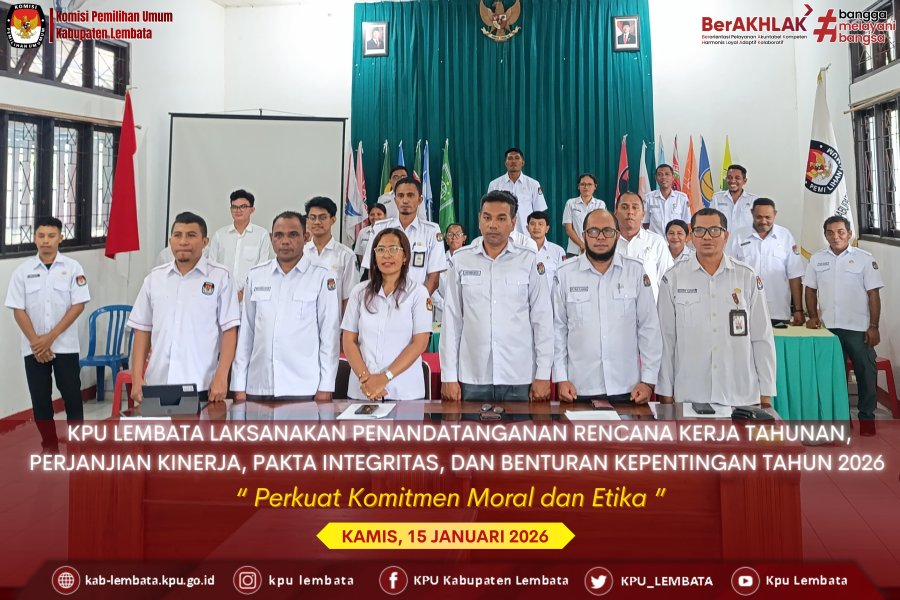 Jajaran pimpinan dan Sekretariat KPU Kabupaten Lembata melaksanakan prosesi penandatanganan Rencana Kerja Tahunan (RKT), Perjanjian Kinerja, Pakta Integritas, dan Komitmen Pengendalian Benturan Kepentingan Tahun 2026 pada Kamis, 15 Januari 2026. Kegiatan yang berpusat di Aula Kantor KPU Kabupaten Lembata ini dilaksanakan secara hybrid (daring dan luring), terhubung langsung dengan KPU Provinsi Nusa Tenggara Timur (NTT). Acara ini dihadiri oleh Ketua dan Anggota KPU Provinsi NTT, Plt. Sekretaris KPU NTT, serta diikuti secara serentak oleh pimpinan KPU dari 22 Kabupaten/Kota se-Provinsi NTT. Kegiatan diikuti oleh Ketua dan Anggota KPU Kabupaten Lembata, Sekretaris, seluruh Kepala Subbagian, serta staf pelaksana.