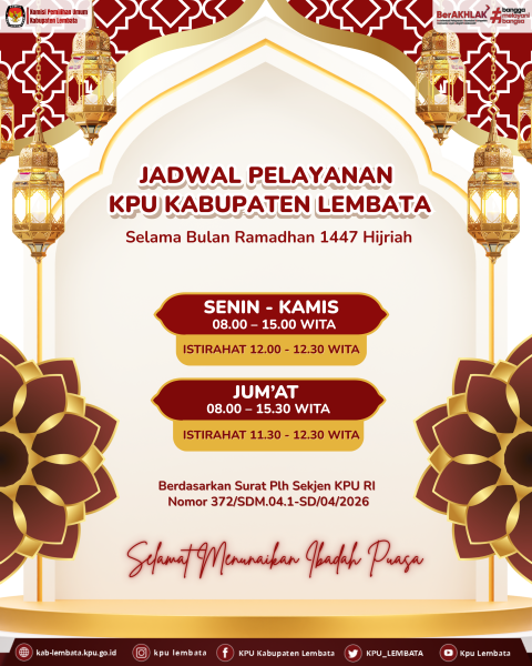 Dalam rangka menyambut dan menjalankan ibadah di bulan suci Ramadhan, berikut penyesuaian jadwal pelayanan di KPU Kabupaten Lembata: