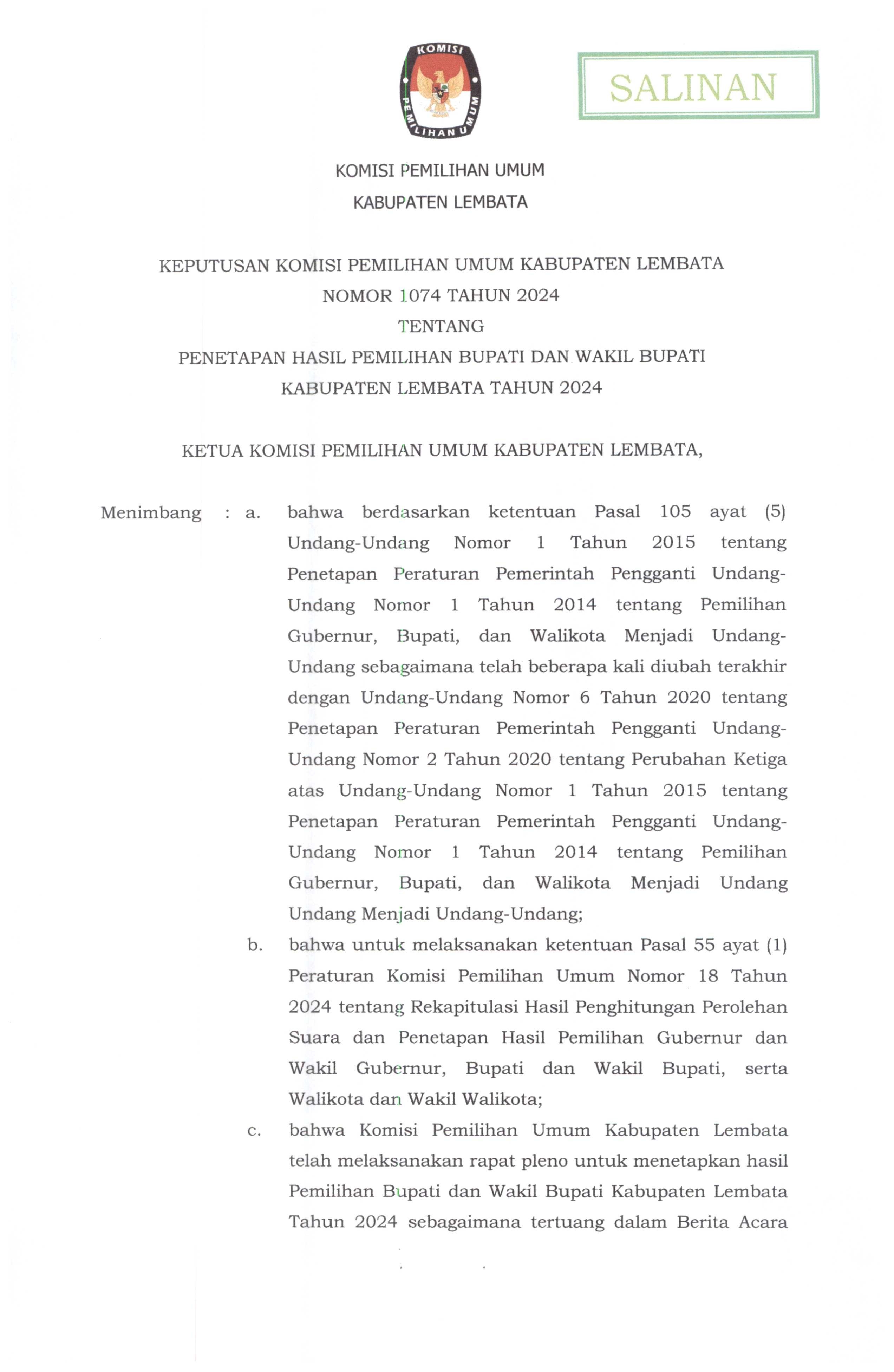 KEPUTUSAN KOMISI PEMILIHAN UMUM KABUPATEN LEMBATA NOMOR 1074 TAHUN 2024 TENTANG PENETAPAN HASIL PEMILIHAN BUPATI DAN WAKIL BUPATI KABUPATEN LEMBATA TAHUN 2024