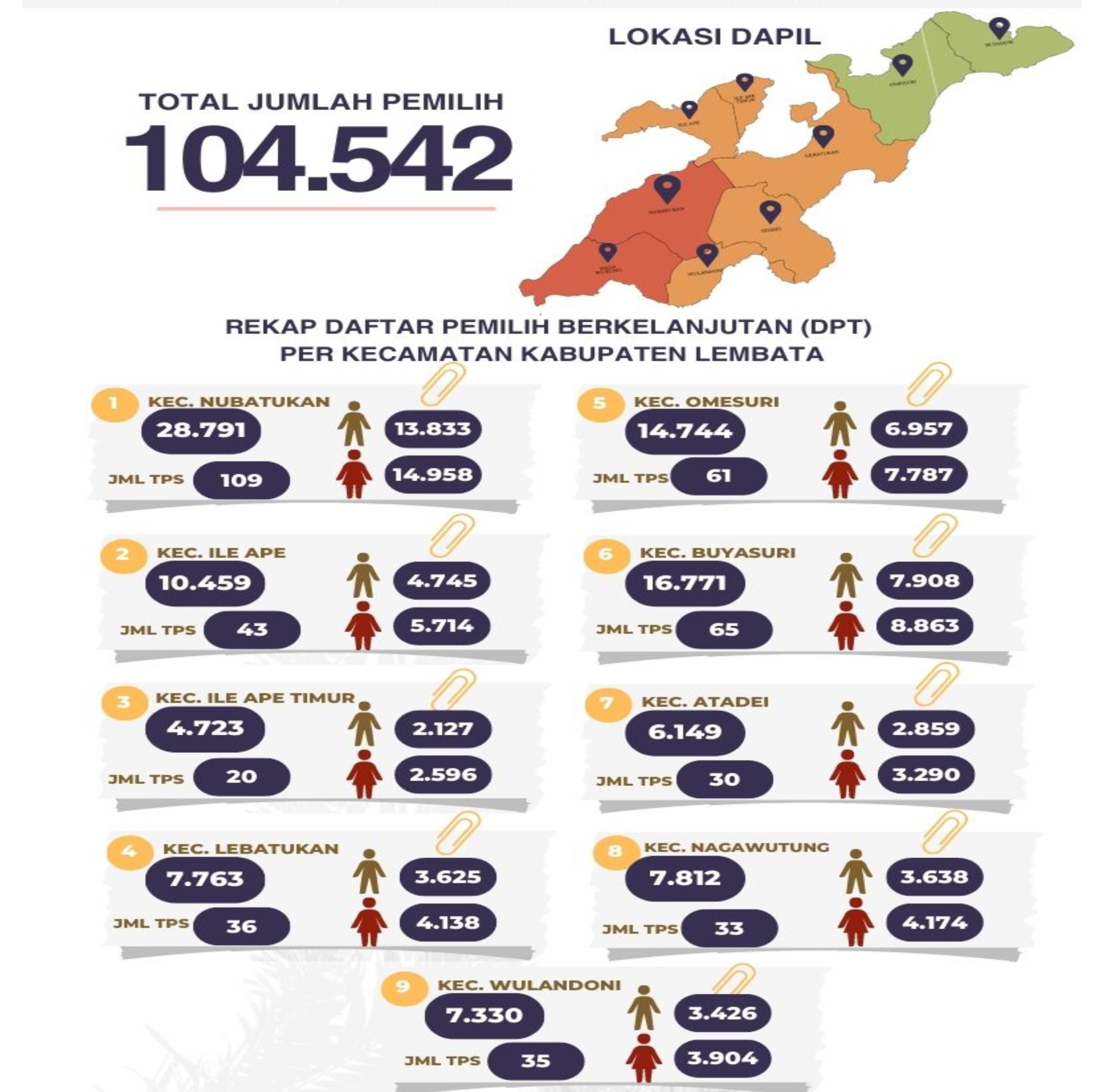 KPU Kababupaten Lembata menetapkan jumlah Daftar Pemilih Tetap (DPT) untuk Pemilu 2024 sebanyak 104.542 Pemilih. Dengan rincian jumlah pemilih laki-laki 49.118 orang dan jumlah pemilih perempuan 55.424 orang yang tersebar pada 432 TPS di seluruh Kabupaten Lembata, termasuk satu TPS lokasi khusus dengan Jumlah pemilih sebanyak 127 orang.