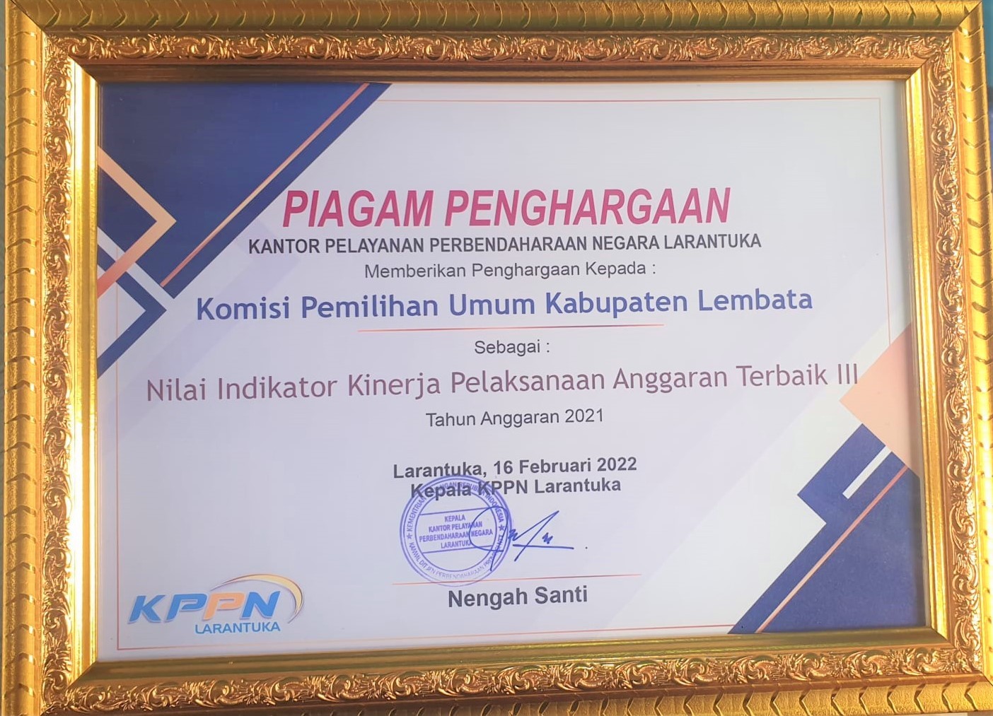 Sekertaris KPU Lembata, Jerremia Ellia David Luase, menerima penghargaan dari (KPPN) Larantuka, Rabu (16/2/2022). Piagam penghargaan yang di tandatangani Kepala KPPN Larantuka, Nengah Santi tertanggal 16 Februari 2022 itu diserahkan Kepala Seksi Pencairan Dana Dan Manajemen Satker, SIbnu Haris Felama.