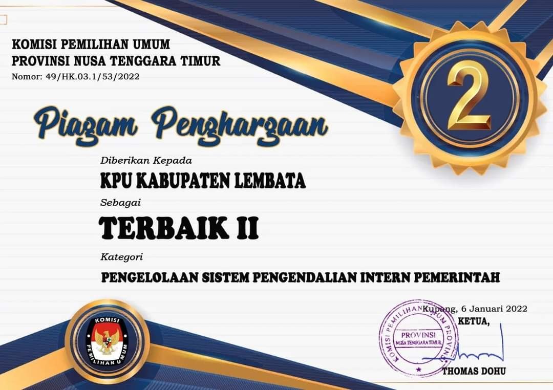 Sebagai informasi, Sebelumnya, KPU Lembata merebut penghargaan Terbaik II pada Sistem Pengendalian Intern Pemerintah (SPIP). dari KPU Propinsi Nusa Tenggara Timur. Piagam penghargaan SPIP ditandatangani ketuanya, Thomas Dohu, tertanggal 6 Januari 2022. (YM/KPU Lembata)