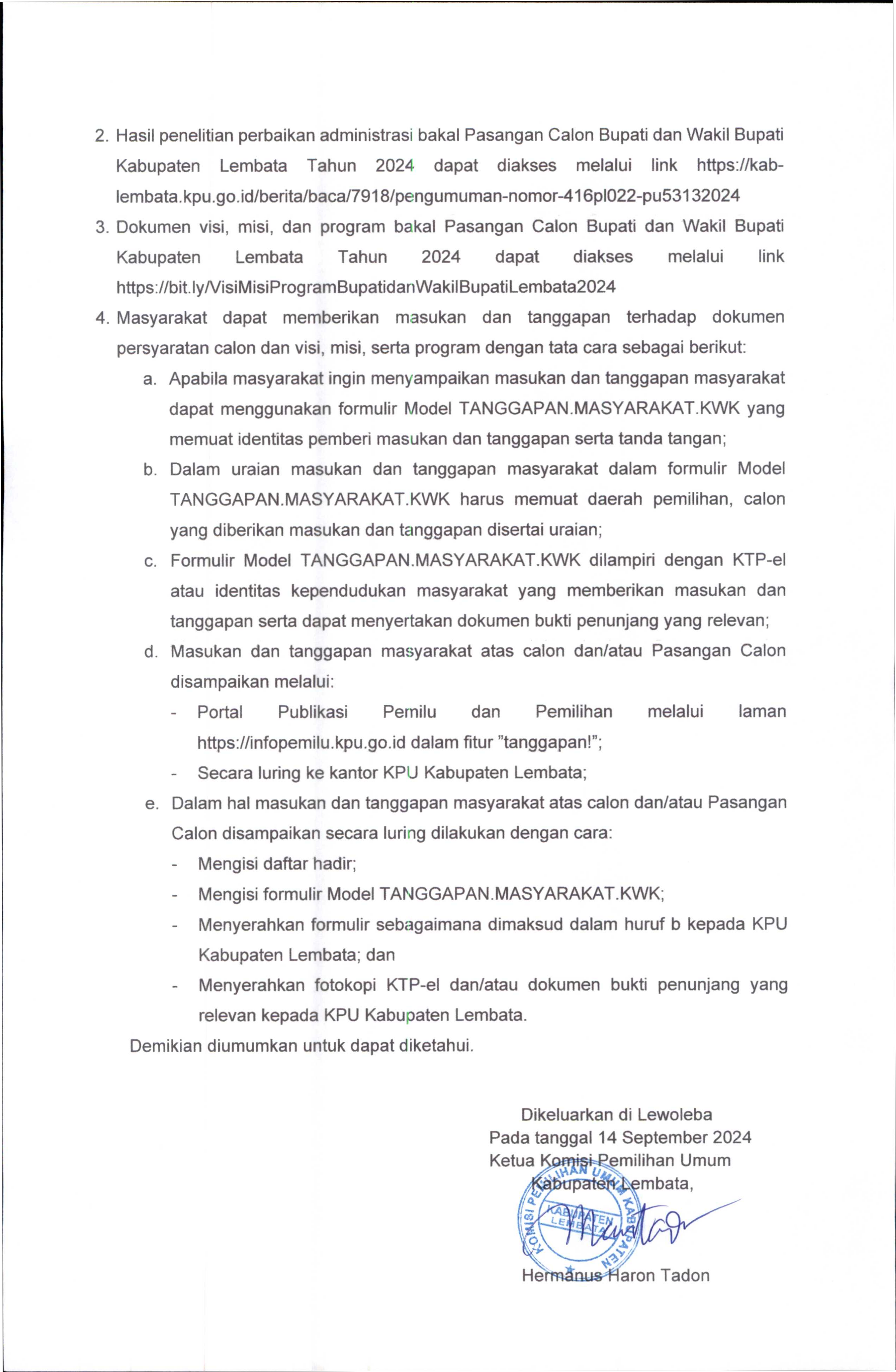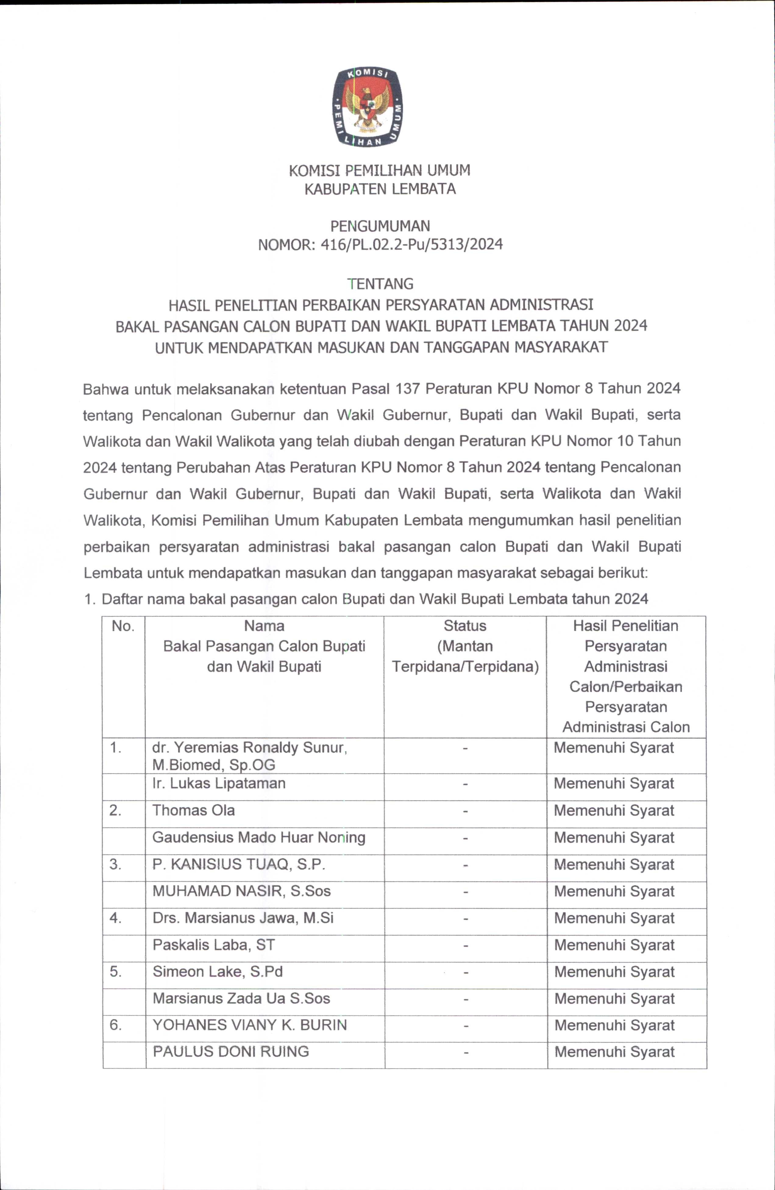 PENGUMUMAN HASIL PENELITIAN PERBAIKAN PERSYARATAN ADMINISTRASI BAKAL PASANGAN CALON BUPATI DAN WAKIL BUPATI LEMBATA TAHUN 2024