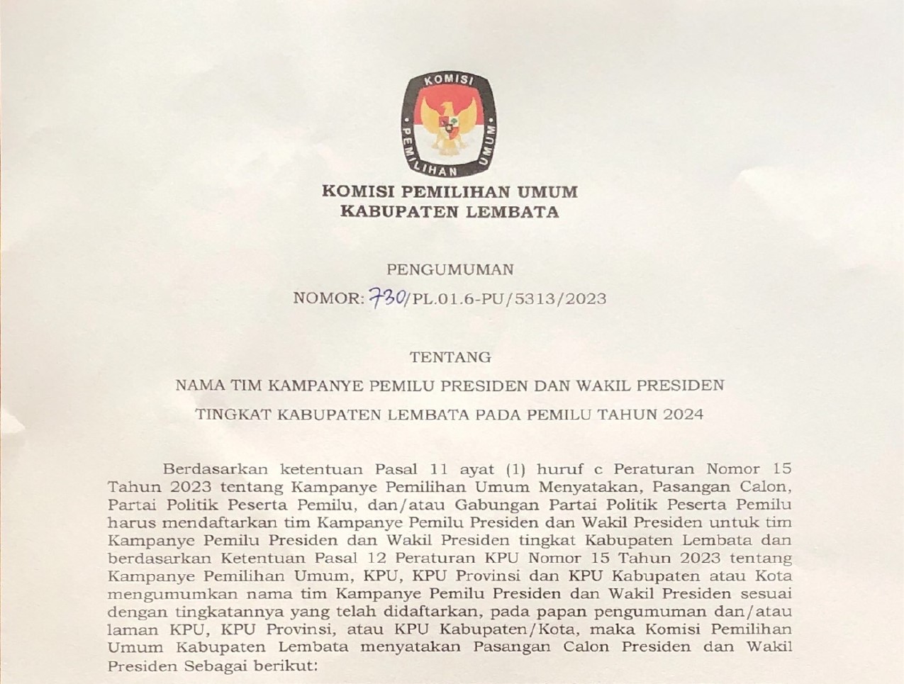 Berdasarkan ketentuan Pasal 11 ayat (1) huruf c Peraturan Nomor 15 Tahun 2023 tentang Kampanye Pemilihan Umum Menyatakan, Pasangan Calon, Partai Politik Peserta Pemilu, dan/atau Gabungan Partai Politik Peserta Pemilu harus mendaftarkan tim Kampanye Pemilu Presiden dan Wakil Presiden untuk tim Kampanye Pemilu Presiden dan Wakil Presiden dan berdasarkan Ketentuan Pasal 12 Peraturan KPU Nomor 15 Tahun 2023 tentang Kampanye Pemilihan Umum, KPU, KPU Provinsi dan KPU Kabupaten atau Kota mengumumkan nama tim Kampanye Pemilu Presiden dan Wakil Presiden sesuai dengan tingkatannya yang telah didaftarkan, pada papan pengumuman dan/atau laman KPU, KPU Provinsi, atau KPU Kabupaten/Kota, maka Komisi Pemilihan Umum Kabupaten Lembata menyatakan Pasangan Calon Presiden dan Wakil Presiden Sebagai berikut: