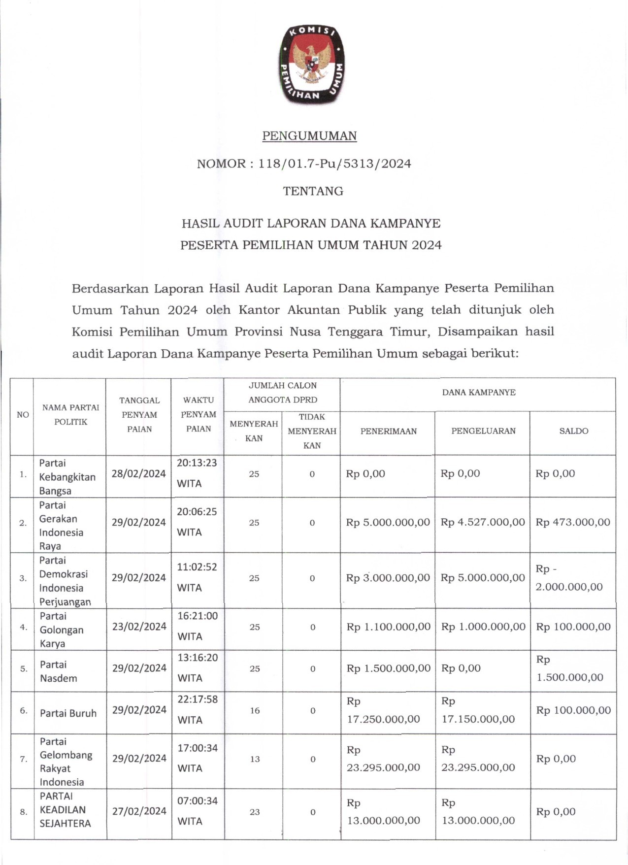KPU Kab. Lembata, Berdasarkan Laporan Hasil Audit Laporan Dana Kampanye Peserta Pemilihan Umum Tahun 2024 oleh Kantor Akuntan Publik yang telah ditunjuk oleh Komisi Pemilihan Umum Provinsi Nusa Tenggara Timur, Disampaikan hasil audit Laporan Dana Kampanye Peserta Pemilihan Umum sebagai berikut, dokumen pengumuman selengkapnya KELIK DISINI