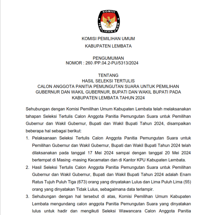PENGUMUMAN TENTANG HASIL SELEKSI TERTULIS CALON ANGGOTA PPS UNTUK PEMILIHAN GUBERNUR DAN WAKIL GUBERNUR, BUPATI DAN WAKIL BUPATI KABUPATEN LEMBATA TAHUN 2024