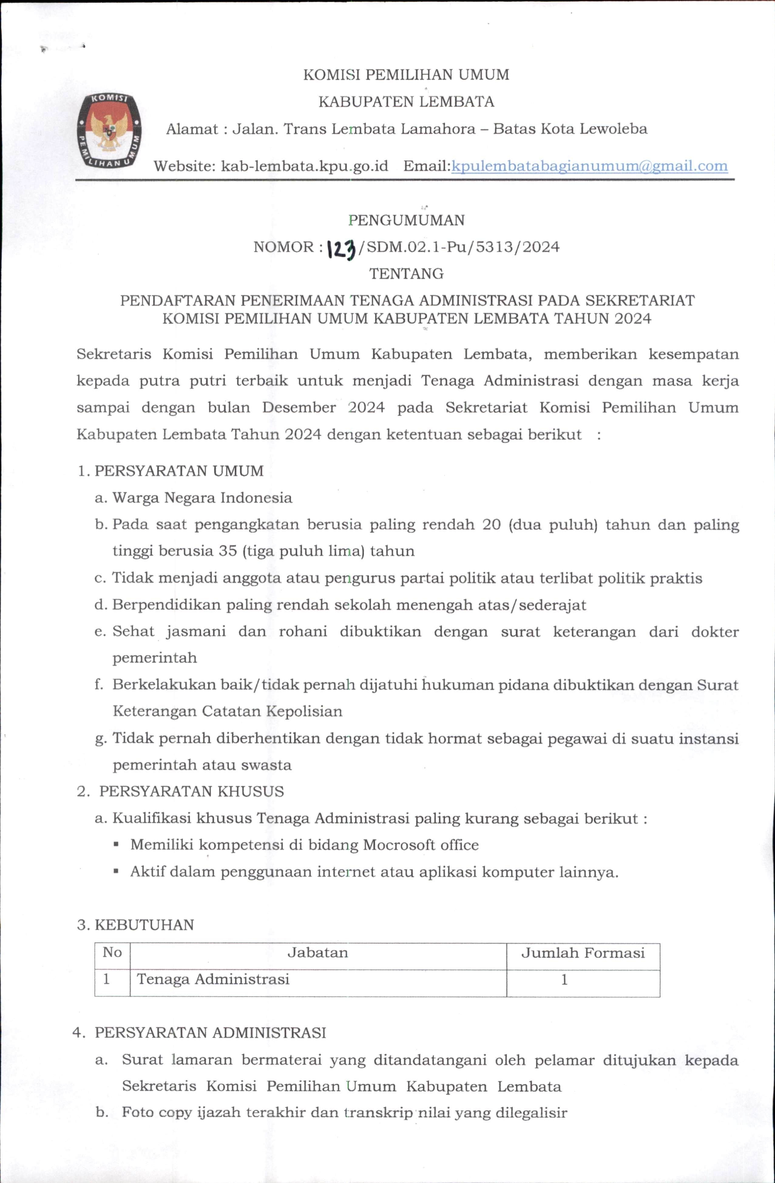 PENGUMUMAN TENTANG PENDAFTARAN PENERIMAAN TENAGA ADMINISTRASI PADA SEKRETARIAT KOMISI PEMILIHAN UMUM KABUPATEN LEMBATA TAHUN 2024
