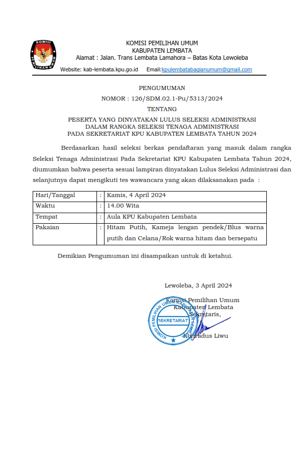 PENGUMUMAN TENTANG PESERTA YANG DINYATAKAN LULUS SELEKSI ADMINISTRASI DALAM RANGKA SELEKSI TENAGA ADMINISTRASI PADA SEKRETARIAT KPU KABUPATEN LEMBATA TAHUN 2024