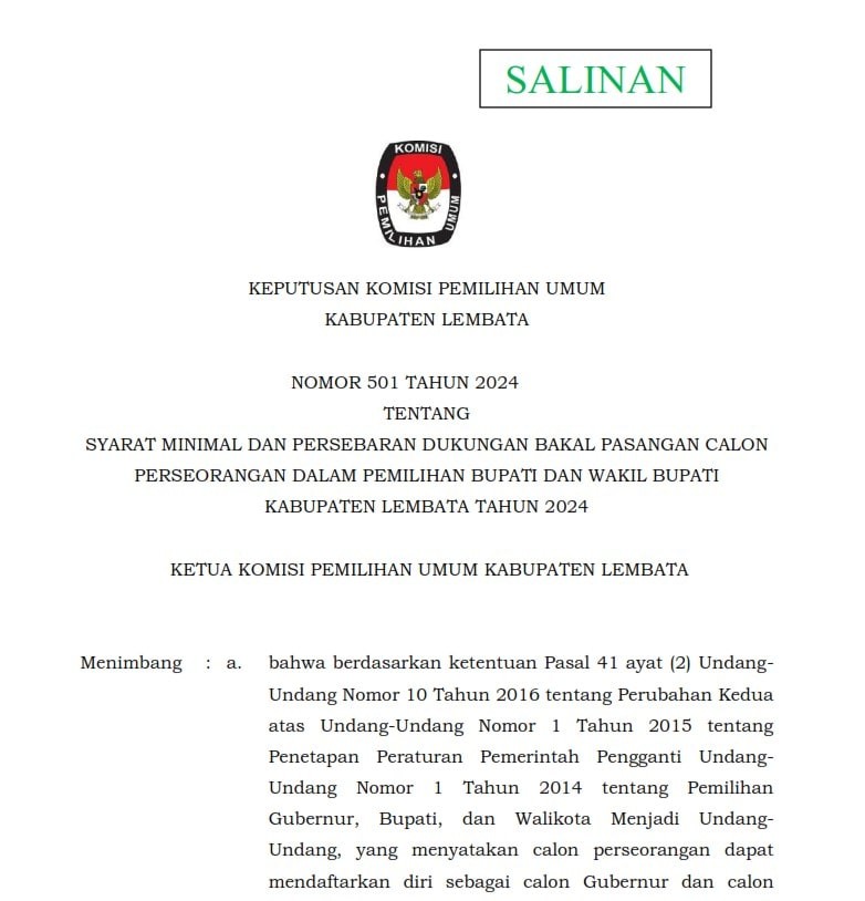 SYARAT MINIMAL DAN PESEBARAN DUKUNGAN BAKAL PASANGAN CALON PERSEORANGAN PILKADA 2024