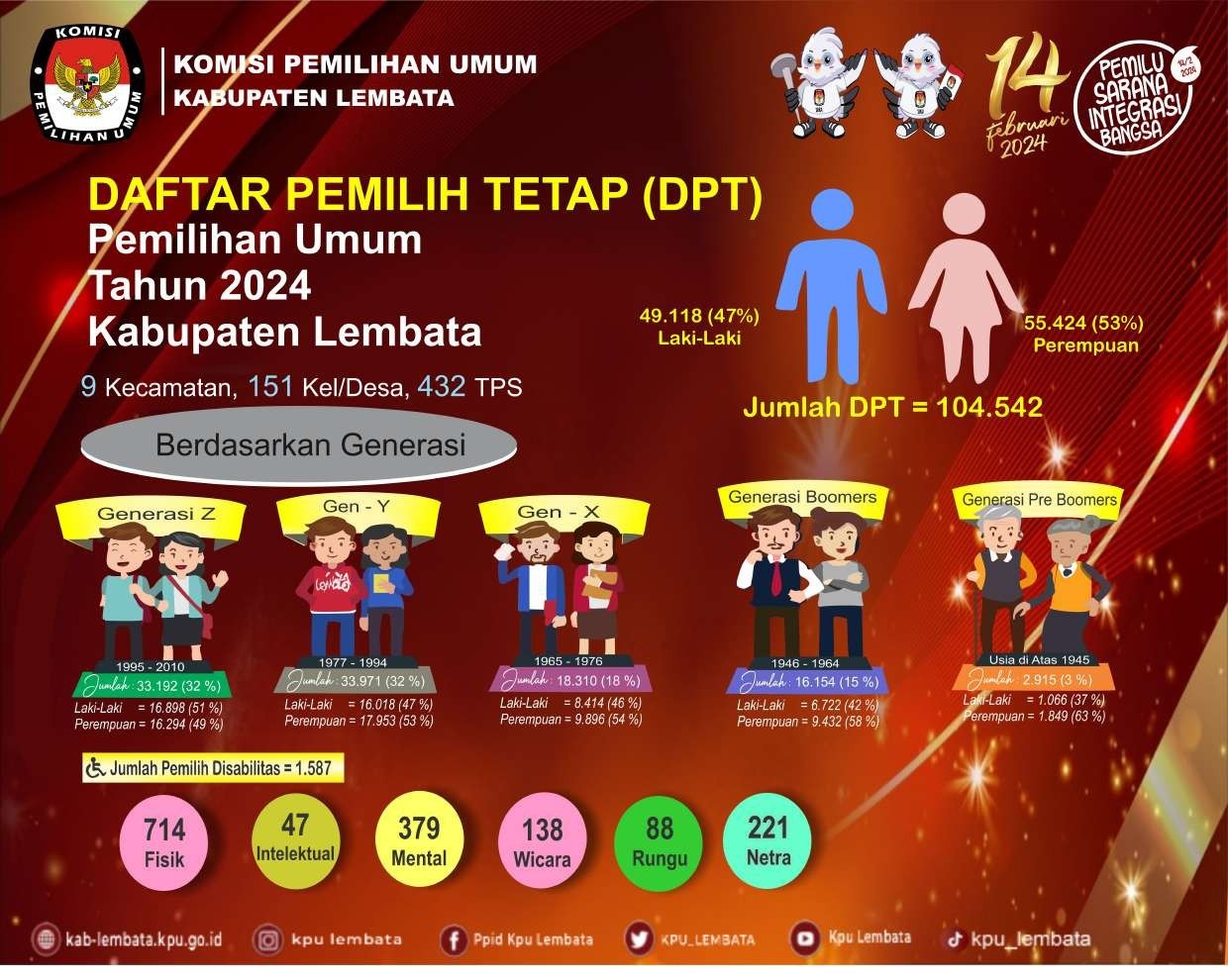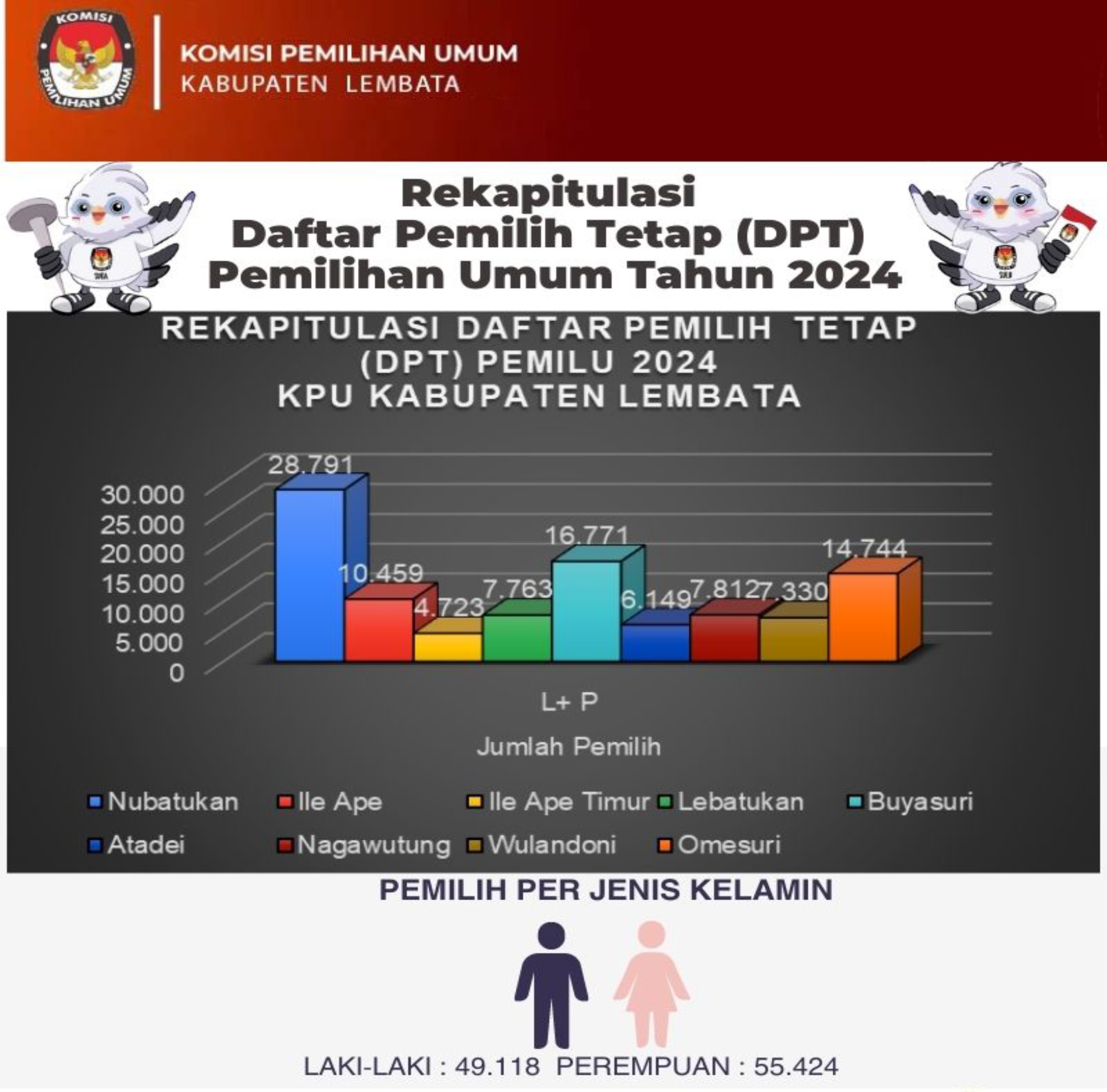 KPULembata - Pemilih milenial dominasi Daftar Pemilih Tetap (DPT) Kabupaten Lembata dalam Pemilu 2024, dengan total pemilih sebanyak 67.163 atau 64 persen dari DPT. Ketua KPU Lembata, Elias Kaluli Making di Kantor KPU Lembata, Selasa 4/7/2023 menjelaskan, Pemilih Lembata sebagaimana ditetapkan dalam Pleno DPT tingkat KPU Kabupaten Lembata, tanggal 22 Juni 2023 sebanyak 104.542, yang terdiri dari pemilih laki-laki 49.118 dan pemilih perempuan 55.424. Pemilih Lembata sebagaimana dimaksud, tersebar di 432 Tempat Pemungutan Suara (TPS) pada 151 Desa/Kelurahan. “DPT Kabupaten Lembata dalam Pemilu 2024 didominasi oleh ketegori pemilih milenial yang terdiri dari dua generasi yakni generasi Y dengan tahun kelahiran 1977-1994, sebanyak 33.971 atau terdiri dari laki-laki 16.018 dan perempuan 17.953, dan pemilih kategori generasi Z dengan tahun kelahiran 1995-2010 terdiri dari pemilih laki-laki sebanyak 16.898, perempuan 16.294 atau sebanyak 33.192. Jadi kategori pemilih muda sebanyak 64 persen, sementara 36 persen sisanya adalah pemilih dengan usia diatas 48 tahun,” Lebih lanjut Elias merinci kategori pemilih generasi pre boomers, tahun kelahiran diatas tahun 1945 sebanyak 2.915, dengan jumlah laki-laki 1.066 dan perempuan 1.849, ketegori pemilih generasi boomers dengan tahun kelahiran 1946-1964 terdiri dari laki-laki 6.722, perempuan 9.432 atau sebanyak 16.154, dan pemilih kategori generasi X tahun kelahiran 1965-1976 sebanyak 18.310 terdiri dari pemilih laki-laki 8.414 dan perempuan 9.896 pemilih. “Rincian pemilih berdasarkan generasi itu bersumber dari DPT hasil Pleno tingkat KPU Lembata tanggal 22 Juni 2023. Daftar nama pemilih sudah diumumkan oleh panitia adhock tingkat desa/kelurahan,” Dikesempatan yang sama, Ketua KPU Lembata juga menghimbau warga pemilih untuk mengecek daftar pemilih yang umumkan panitia adhock tingkat desa kelurahan pada ruang-ruang public, juga secara mandiri mengecek melalui aplikasi cek data pemilih on line, melalui laman https://cekdptonline.kpu.go.id/ (Yogi Making).