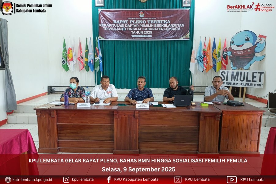 KPU LEMBATA GELAR RAPAT PLENO, BAHAS BMN HINGGA SOSIALISASI PEMILIH PEMULA #TemanPemilih KPU Kabupaten Lembata menggelar Rapat Pleno Rutin pada Selasa, 9 September 2025 yang bertempat di Aula kantor KPU Lembata. Rapat dipimpin oleh Ketua KPU Kabupaten Lembata, Hermanus Haron Tadon, serta dihadiri oleh Anggota KPU Kabupaten Lembata; Idris Beda, Petrus Paulus Juang, Paulina Y. B. Tokan, Ibrahim Kader, Sekretaris KPU Kabupaten Lembata; Konradus Liwu, para Kasubag, serta staf. Agenda rapat mencakup laporan kesekretariatan, progres penulisan buku, serta pengisian Survei Kepuasan Pengguna Sistem Informasi KPU. Beberapa keputusan penting di antaranya persiapan lelang BMN; kendaraan dinas roda dua dan empat, penghimpunan dokumen Berita Acara dan Surat Keputusan tahun 2021–2025, serta pengawasan ketat penggandaan surat suara untuk keperluan museum. Selain hal tersebut, rapat juga membahas perlunya pengawasan ketat pada penggandaan surat suara untuk keperluan museum agar tidak disalahgunakan serta rencana kegiatan sosialisasi pemilih pemula di SMKN 1 Lewoleba pada Kamis, 11 September 2025. Ada pula rencana penggunaan domain internal untuk penyimpanan data. #KPULembata #KPUMelayani