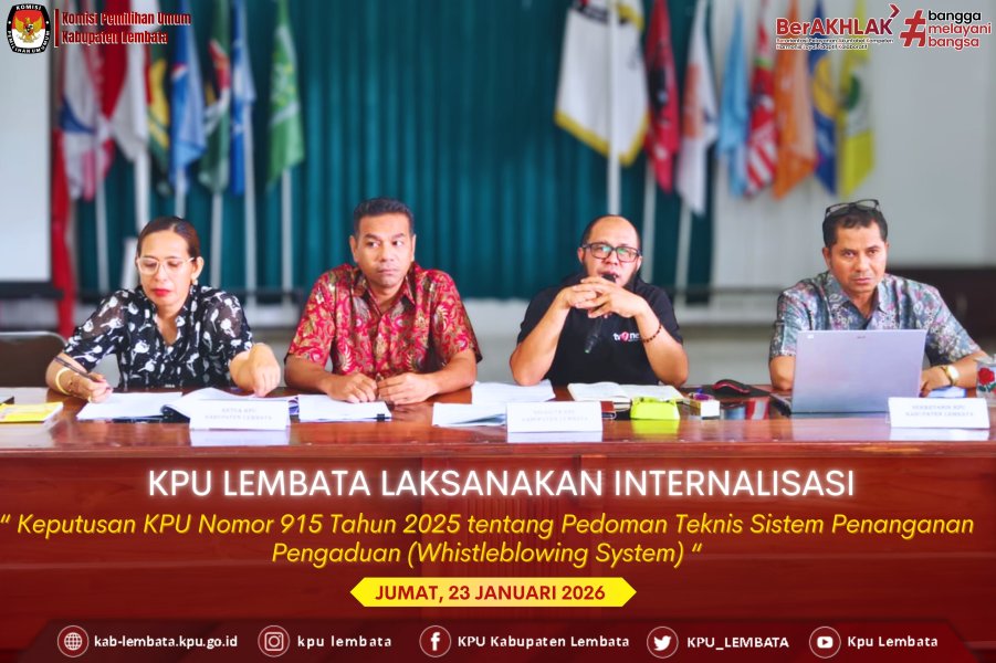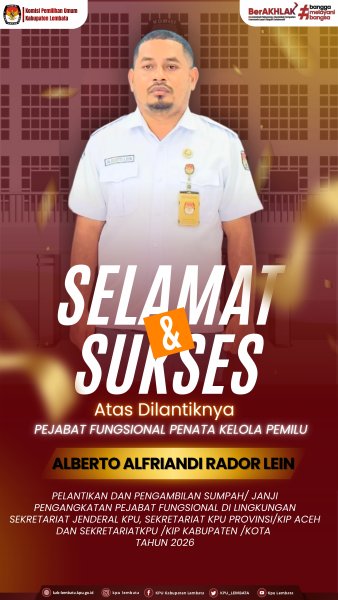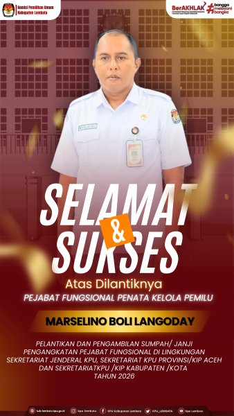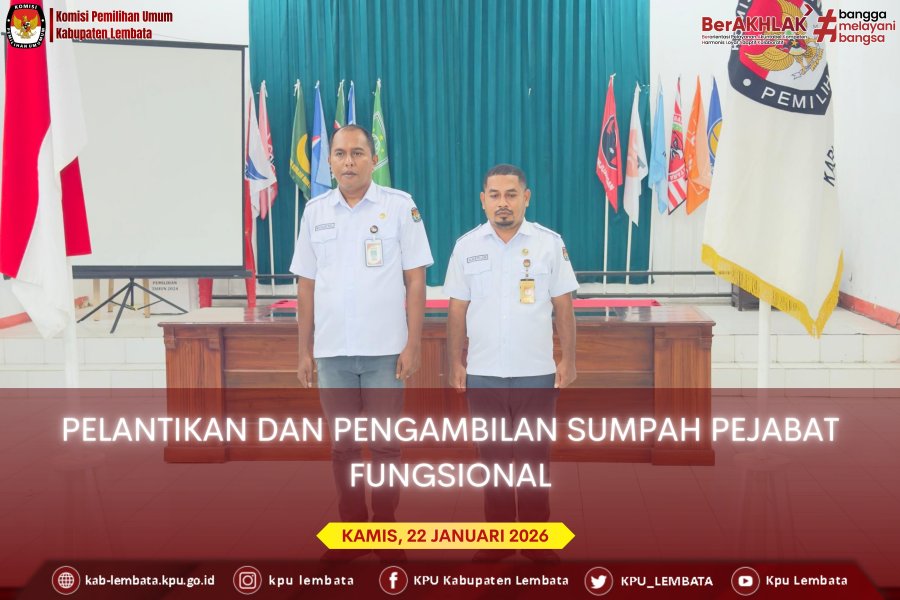 KPU Kabupaten Lembata mengikuti Pelantikan dan Pengambilan Sumpah/Janji Pejabat Fungsional di Lingkungan Sekretariat Jenderal KPU/Sekretariat KPU Provinsi/KIP Aceh dan Sekretariat KPU/KIP Kabupaten/Kota Tahun 2026 pada Kamis, 22 Januari 2026. Kegiatan yang dilaksanakan di aula kantor KPU Kabupaten Lembata ini diikuti oleh Sekretaris KPU Kabupaten Lembata Konradus Liwu, Kasubag Hukum dan SDM Joenady Wongso, Kasubag Teknis Penyelenggaraan Pemilu, Partisipasi dan Hubmas, Eduard O. B. Gorantokan, staf pejabat fungsional yang bersangkutan dan 3 staf Hukum dan SDM.