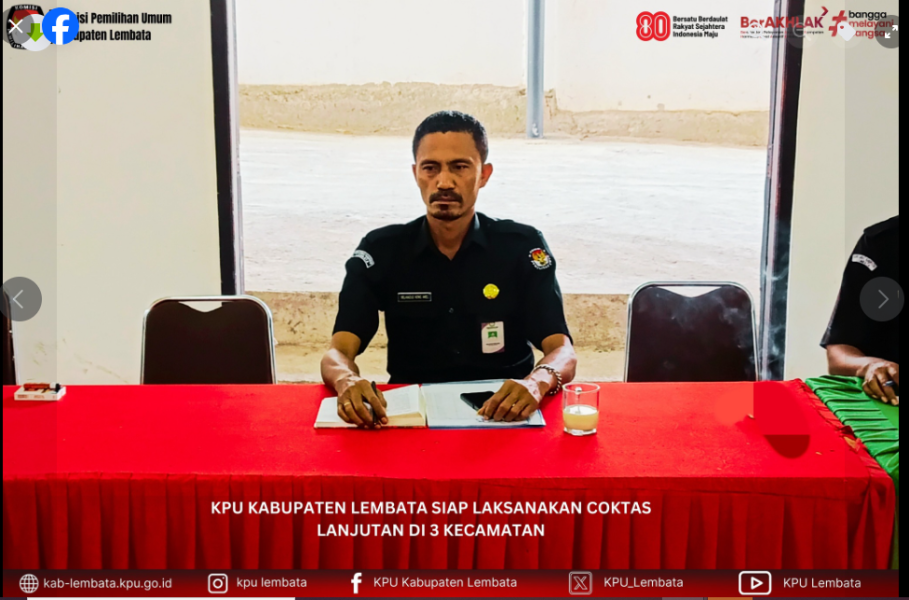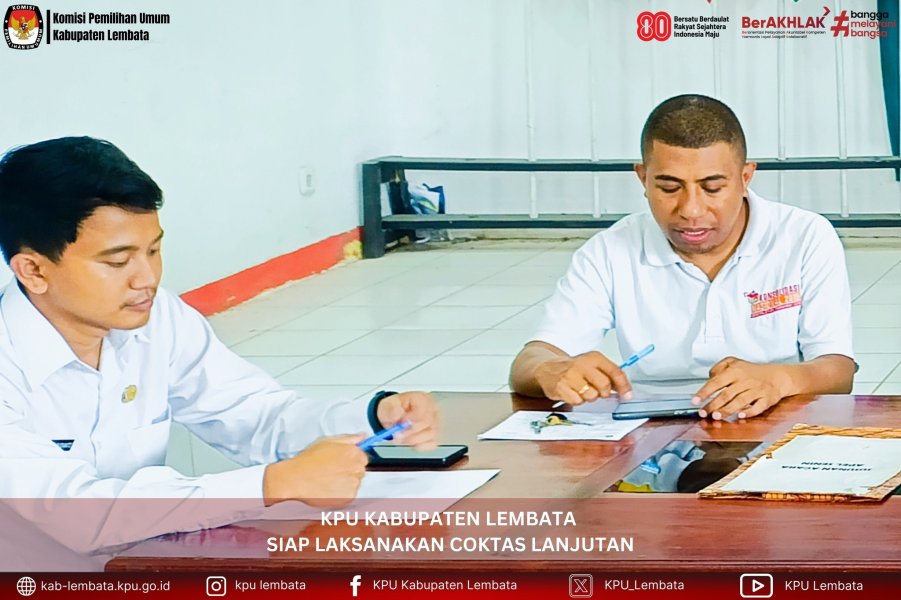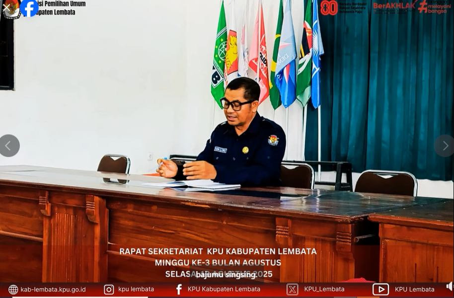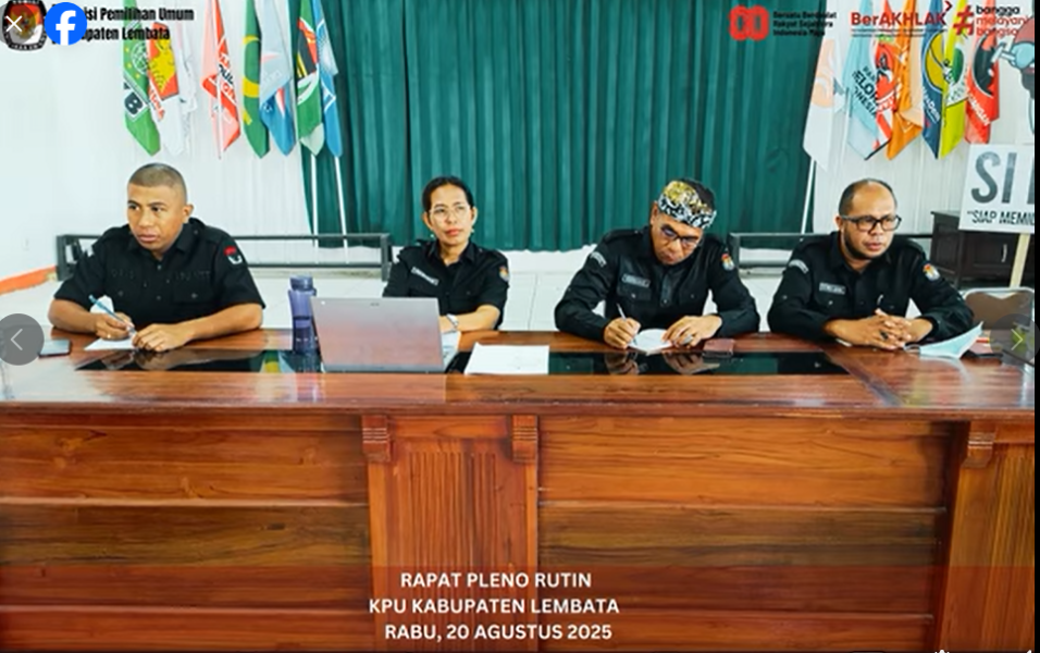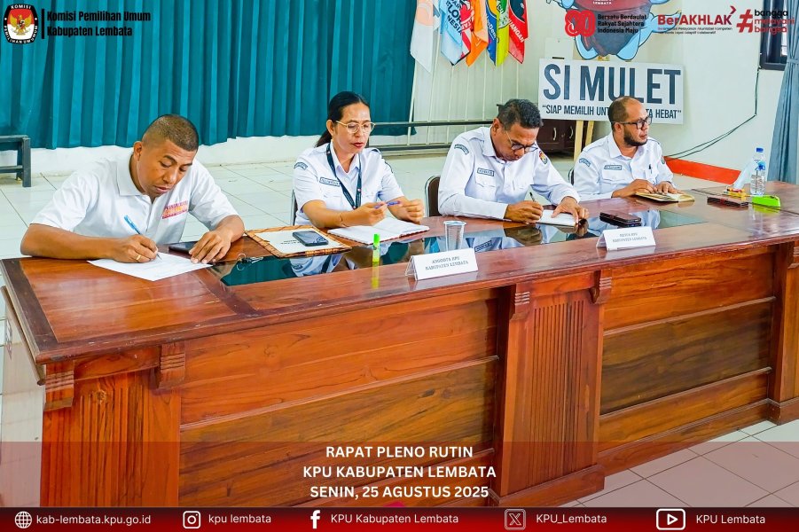 KPU LEMBATA GELAR PLENO RUTIN MINGGU KE-4 AGUSTUS #TemanPemilih KPU Kabupaten Lembata mengadakan Rapat Pleno Rutin pada Senin, 25 Agustus 2025 bertempat di ruang aula kantor KPU Kabupaten Lembata. Rapat dihadiri oleh Ketua KPU Kabupaten Lembata; Hermanus Haron Tadon, Anggota KPU Kabupaten Lembata; Petrus Paulus Juang, Paulina Y. B. Tokan, dan Idris Beda, Sekretaris KPU Kabupaten Lembata; Konradus Liwu, para Kasubag, serta seluruh staf. Kegiatan dibuka oleh Ketua KPU Lembata, Hermanus Haron Tadon. Sebagai pembuka, Hermanus memberikan beberapa masukan terkait tata cara penyelenggaraan apel senin pagi. Menurutnya pembacaan Pembukaan UUD 1945 dan Panca Prasetya Korps Pegawai Republik Indonesia perlu memperhatikan tanda baca dan artikulasi yang jelas oleh petugas. Pemimpin apel yang mulai dilakukan oleh pegawai Eselon IV juga perlu memperhatikan hal-hal teknis lain demi terselenggaranya apel pagi yang tertib dan khidmat. Dalam rapat tersebut ketika membahas agenda berikutnya tentang coktas, Ketua Divisi Rendatin, Idris Beda, menyampaikan bahwa kegiatan coktas lanjutan harus dilaksanakan dalam minggu ini dan secara teknis akan disampaikan oleh Kasubag Rendatin, demikian ujar Idris. Menindaklanjuti arahan Ketua Divisi Kasubag Rendatin, Melkiadus Nong Akel, juga menyampaikan materi terkait coktas (pencocokan terbatas) lanjutan. Berdasarkan pemaparannya, kegiatan tersebut akan melibatkan 4 (empat) tim yang dipecah untuk melakukan coktas terhadap total 12 (dua belas) pemilih di 3 (tiga) kecamatan; yakni Omesuri, Buyasuri dan Wulandoni. Pembagian tim ini diharapkan dapat mempermudah kegiatan coktas sekaligus melakukan pembaharuan data pemilih dengan lebih akurat di Kabupaten Lembata. #KPULembata #KPUMelayani
