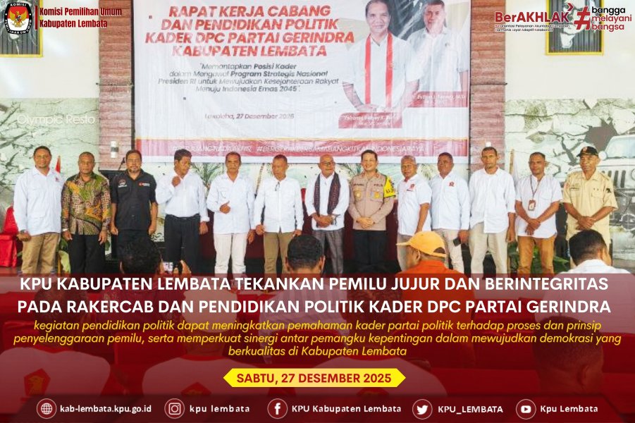 Komisi Pemilihan Umum (KPU) Kabupaten Lembata menghadiri kegiatan Rapat Kerja Cabang (Rakercab) dan Pendidikan Politik Kader yang diselenggarakan oleh Dewan Pimpinan Cabang (DPC) Partai Gerindra Kabupaten Lembata, bertempat di Ballroom Olympic, Lewoleba, Sabtu (27/12/2025).