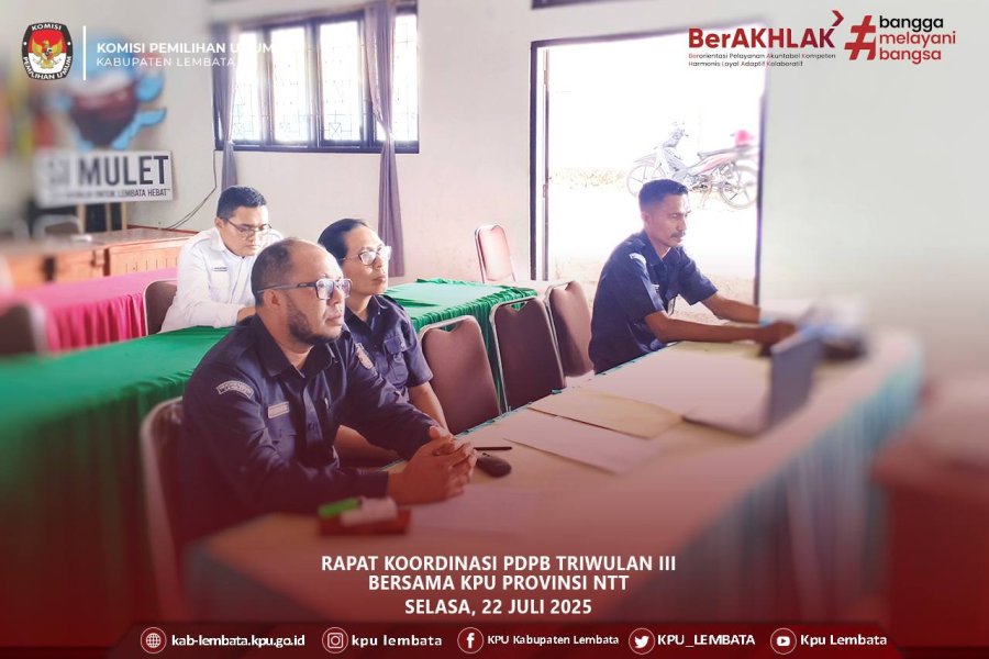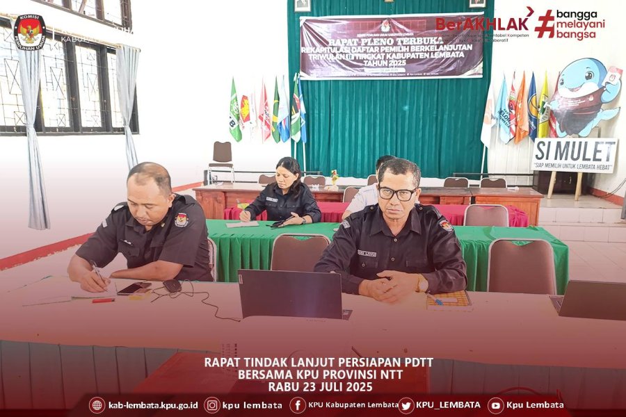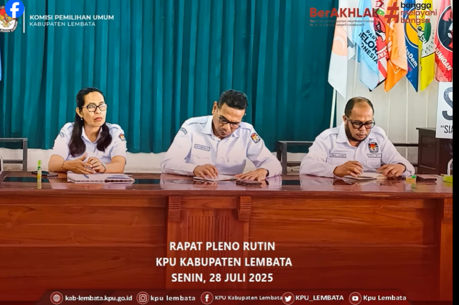 PLENO RUTIN MINGGU KE-5 JULI DIGELAR #TemanPemilih KPU Kabupaten Lembata mengadakan Rapat Pleno Rutin pada Senin, 28 Juli 2025 yang bertempat di aula kantor KPU Kabupaten Lembata. Rapat yang dipimpin oleh Ketua KPU Kabupaten Lembata, Hermanus Haron Tadon dan dihadiri oleh para Komisioner; Paulina Y. B. Tokan, dan Petrus Paulus Juang, Sekretaris KPU Kabupaten Lembata; Konradus Liwu, para Kasubag serta seluruh staf ini membahas tentang Laporan Kesekretariatan, Progres Penulisan Buku, dan Progres Sosialisasi dan Pendidikan Pemilih. Dalam laporan kesekretariatan, para Kasubag menyampaikan progres kegiatan sebagai tindak lanjut pleno rutin terdahulu. Giliran pertama Kasubag Rendatin Melkiadus Nong Akel melaporkan progres pengelolaan PDPB dan revisi anggaran. Selanjutnya Kasubag Teknis, Penyelenggaraan Pemilu, Partisipasi dan Hubmas (Tekparhubmas), Eduard Ola Bebe Gorantokan menyampaikan pentingnya koordinasi oleh rekan-rekan untuk tidak membebani satu pihak dengan banyak pengelolaan aplikasi agar dapat memastikan tiap sistem informasi dapat berfungsi optimal. Selain itu Kasubag Keuangan, Umum dan Logistik (KUL), Siti Rahayu Ibrahim Lapaleng juga melaporkan terkait adanya pemeriksaan oleh Badan Pemeriksa Keuangan (BPK). Ia menerangkan bahwa perjalanan dinas menjadi tanggung jawab masing-masing personal, sehingga perlu kesadaran diri untuk melampirkan data terkait kepada pengelola keuangan agar dapat dibereskan sebelum pemeriksaan. #KPULembata #KPUMelayani