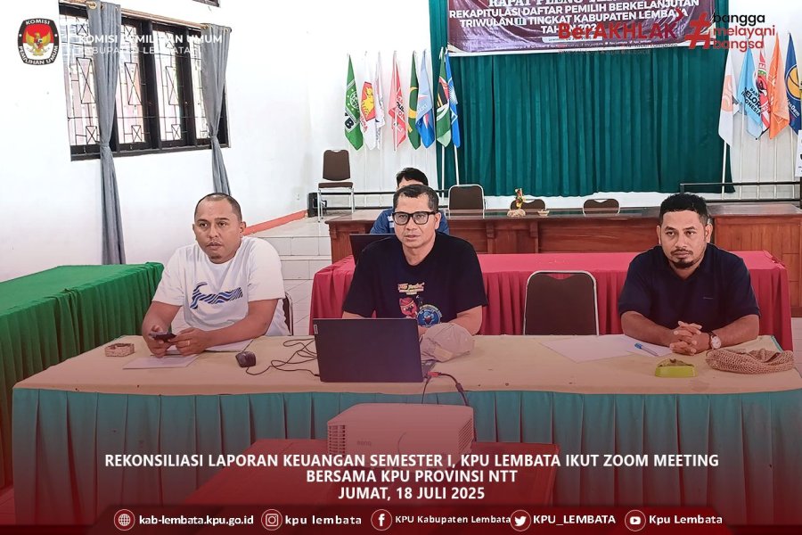 REKONSILIASI LAPORAN KEUANGAN SEMESTER I, KPU LEMBATA IKUT ZOOM MEETING #TemanPemilih Berkaitan dengan pelaksanaan rekonsiliasi, penyusunan dan penyampaian Laporan Keuangan Semester I Tahun 2025, KPU Lembata mengikuti kegiatan Pendampingan yang dilakukan oleh KPU Provinsi NTT. Kegiatan diikuti secara daring via zoom bertempat di Aula KPU Lembata pada Jumat, 18 Juli 2025. Kegiatan ini juga didampingi langsung oleh Tim Biro Keuangan Sekretariat Jenderal KPU RI. Kegiatan yang berlangsung di Aula KPU Lembata ini diikuti oleh Sekretaris KPU Lembata, Konradus Liwu, Kasubag Keuangan, Umum, dan Logistik (KUL), Siti Rahayu Ibrahim Lapaleng, bendahara, operator akuntansi dan pelaporan, beserta staf. Kegiatan pendampingan via zoom ini diawali dengan arahan dari Kepala Bagian Akuntansi dan Pelaporan KPU RI, Aminsyah. “Semoga dalam menjalani dan menyusun semua laporan pertanggungjawaban keuangan bisa aman terlaksana walaupun dalam berjalannya waktu pasti ada saja kendala yang kita semua hadapi. Dalam menyusun laporan keuangan ini bukan hanya tanggungjawab operator/sekretariat tetapi menjadi tanggungjawab kita semua termasuk pimpinan KPU. KPU RI berkomitmen mengeluarkan keuangan dengan pengeluaran yang berkualitas walaupun dengan adanya situasi efisiensi yang masih berlangsung,” ungkapnya. Dengan adanya pendampingan ini, diharapkan dapat membantu setiap satuan kerja dalam menyelesaikan to-do list penyusunan Laporan Keuangan Semester I Tahun 2025. Turut hadir dalam kegiatan tersebut Kabag Keuangan, Umum, dan Logistik (KUL); Kasubbag Keuangan; Bendahara Pengeluaran dan Bendahara Pengeluaran Pembantu; serta operator akuntansi dan pelaporan dari KPU Provinsi maupun KPU Kabupaten/Kota se-NTT. #KPULembata #KPUMelayani