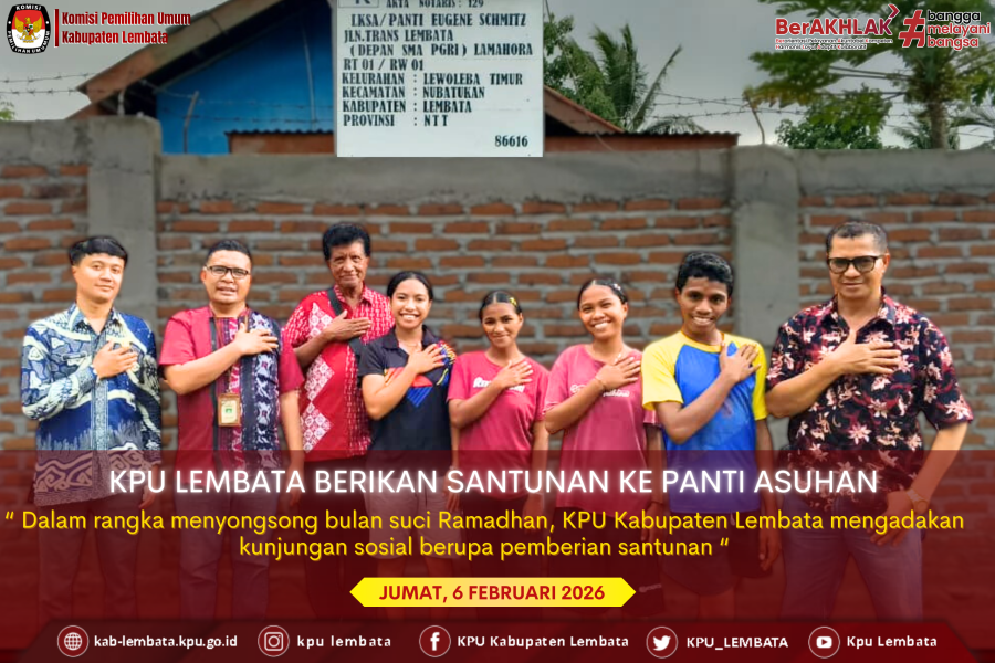 Halo, #TemanPemilih! Dalam rangka menyongsong bulan suci Ramadhan, KPU Kabupaten Lembata mengadakan kunjungan sosial berupa pemberian santunan pada Jumat, 6 Februari 2026 di Panti Asuhan Eugene Schmitz, Yayasan Pondok Kasih Indah, Lewoleba Timur, Nubatukan, Lembata. Santunan diberikan oleh Sekretaris KPU Kabupaten Lembata, Konradus Liwu, bersama dengan Kasubag Parmas SDM Joenady Wongso, serta ditemani oleh 4 staf. Dalam kunjungan tersebut, KPU Kabupaten Lembata disambut oleh Sekretaris panti, Silvester Wutun. “Kami bersyukur bahwa bapak dan ibu dari KPU bisa berkunjung, saya percaya semua ini terjadi karena campur tangan Tuhan.” ungkapnya dalam pertemuan hangat tersebut. Silvester menjelaskan bahwa saat ini terdapat 18 anak yang dirawat di panti. Ia juga mengatakan bahwa panti telah berdiri sejak tahun 2002 dan anak yang pernah tinggal disana telah mencapai 206 orang, yang mana dua diantaranya merupakan penyandang disabilitas mental. “Panti kami berlandaskan Katolik, namun pernah ada dua anak yang beragama Islam disini. Kami berbicara soal manusia dan kemanusiaan.” terangnya. Menanggapi hal tersebut, Konradus menyampaikan harapannya agar perhatian dan kasih yang diberikan oleh keluarga besar KPU Kabupaten Lembata ini dapat menjadi harapan untuk adik-adik di panti agar dapat membuka jalan dan masa depan yang lebih baik. “Tidak banyak yang kami sumbangkan. Namun yang terpenting adalah agar kita saling mendoakan. Kunci dari keberhasilan anak-anak itu disiplin. Sekalipun kami bukan donatur tetap, tapi bantuan moril kami berupa doa untuk adik-adik semua.” demikian ujar Konradus. #KPULembata #KPUMelayani #ParmasKPULembata