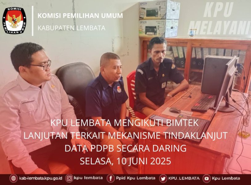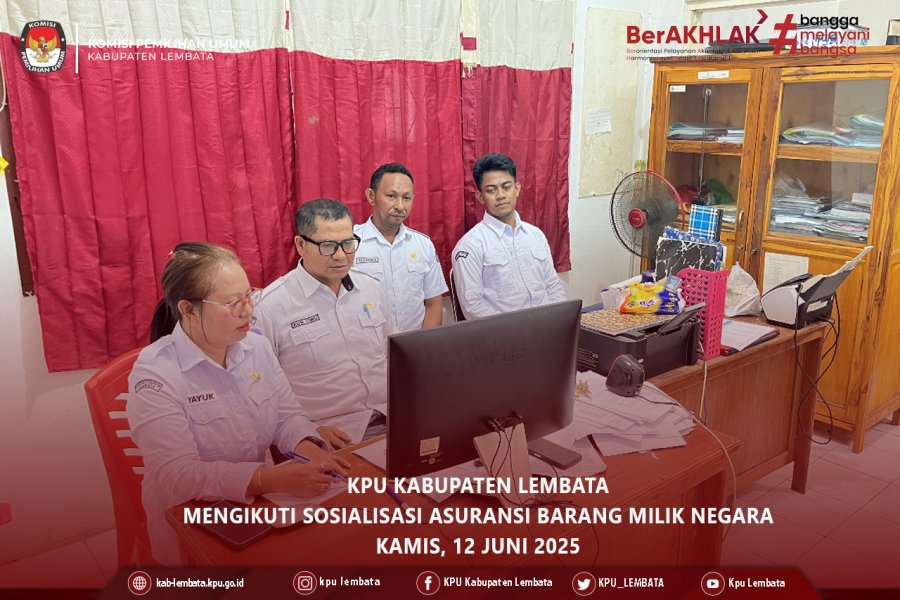 Kamis, 12 Juni 2025, KPU Kabupaten Lembata mengikuti Sosialisasi Asuransi Barang Milik Negara (ABMN) Tahun Anggaran 2025 secara daring melalui zoom meeting, bertempat di ruang Sub Bagian Keuangan, Umum, dan Logistik kantor KPU Kabupaten Lembata.