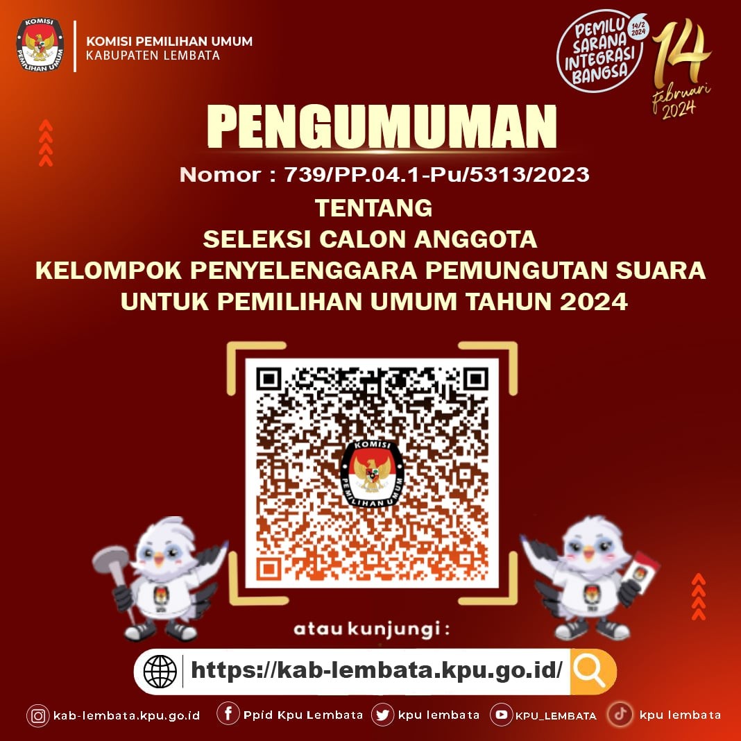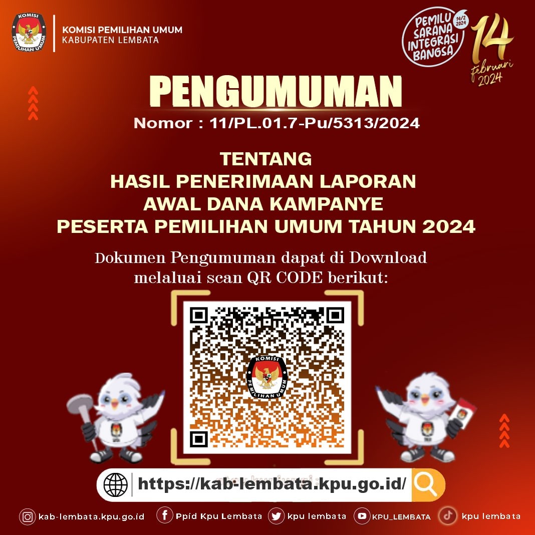 Berdasarkan ketentuan Pasal 11 ayat (1) huruf c Peraturan Nomor 15 Tahun 2023 tentang Kampanye Pemilihan Umum Menyatakan, Pasangan Calon, Partai Politik Peserta Pemilu, dan/atau Gabungan Partai Politik Peserta Pemilu harus mendaftarkan tim Kampanye Pemilu Presiden dan Wakil Presiden untuk tim Kampanye Pemilu Presiden dan Wakil Presiden dan berdasarkan Ketentuan Pasal 12 Peraturan KPU Nomor 15 Tahun 2023 tentang Kampanye Pemilihan Umum, KPU, KPU Provinsi dan KPU Kabupaten atau Kota mengumumkan nama tim Kampanye Pemilu Presiden dan Wakil Presiden sesuai dengan tingkatannya yang telah didaftarkan, pada papan pengumuman dan/atau laman KPU, KPU Provinsi, atau KPU Kabupaten/Kota, maka Komisi Pemilihan Umum Kabupaten Lembata menyatakan Pasangan Calon Presiden dan Wakil Presiden Sebagai berikut: